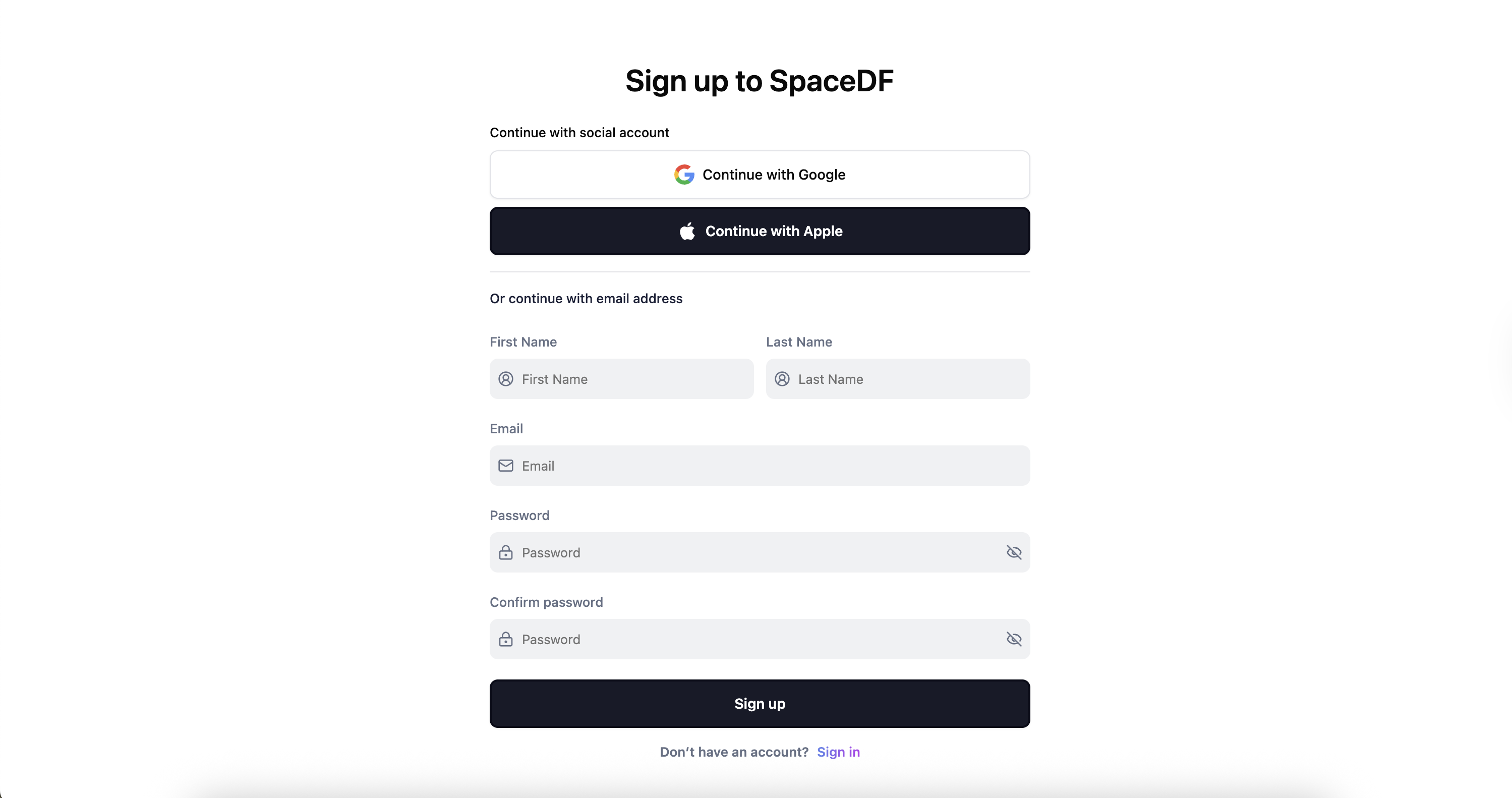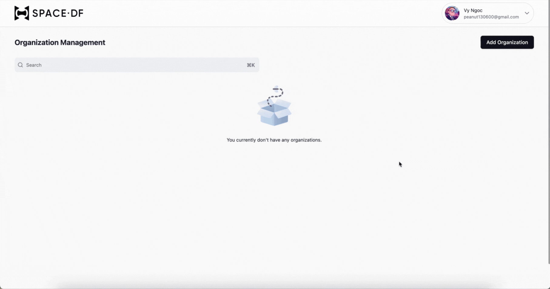 Once you create your SpaceDF account, your workspace will be generated automatically. From here, you can manage and view all your organizations in one place.