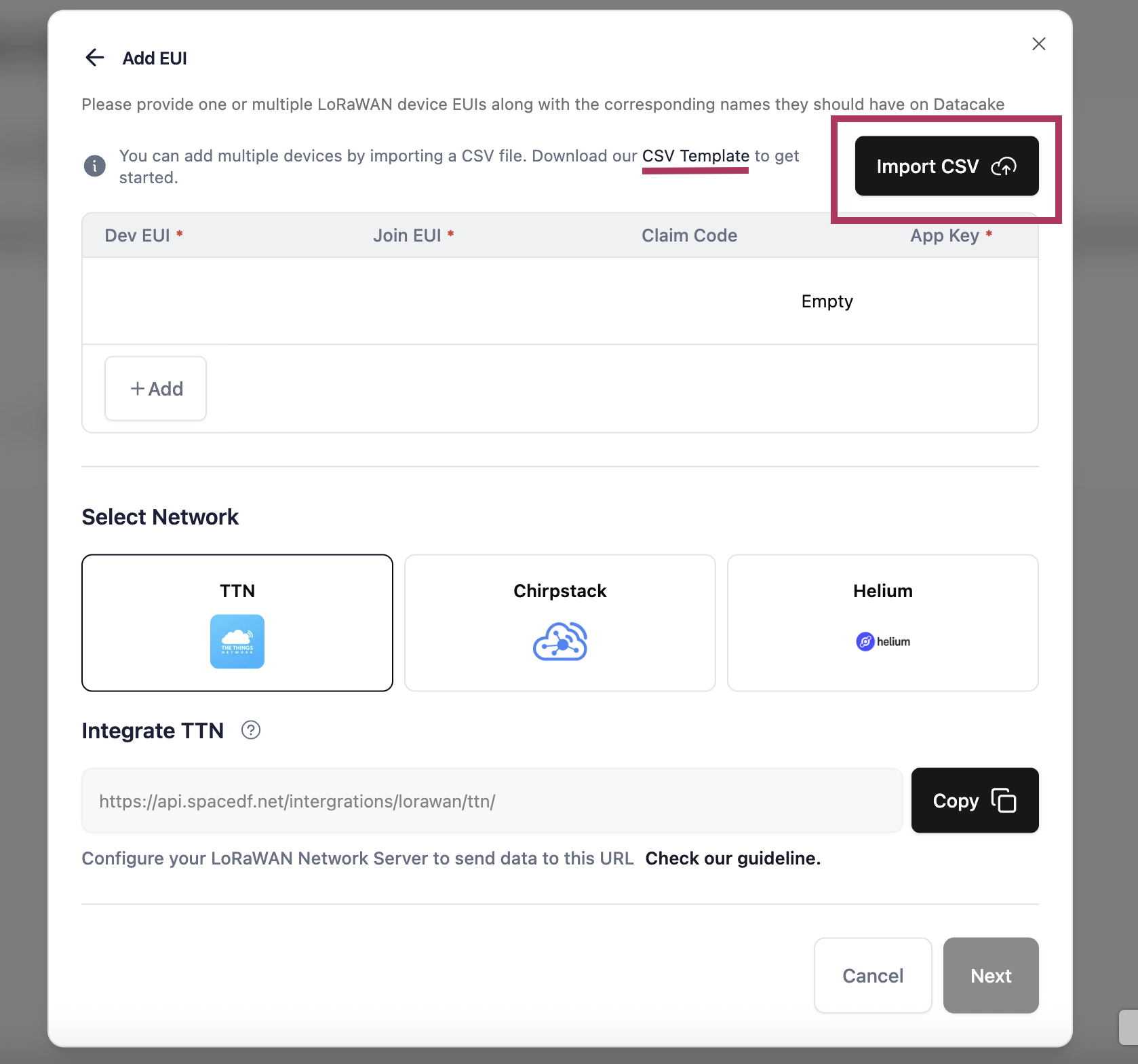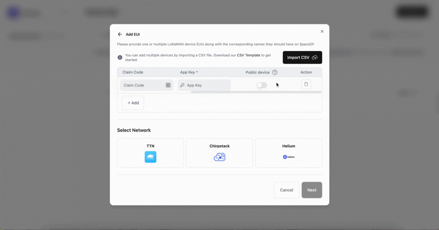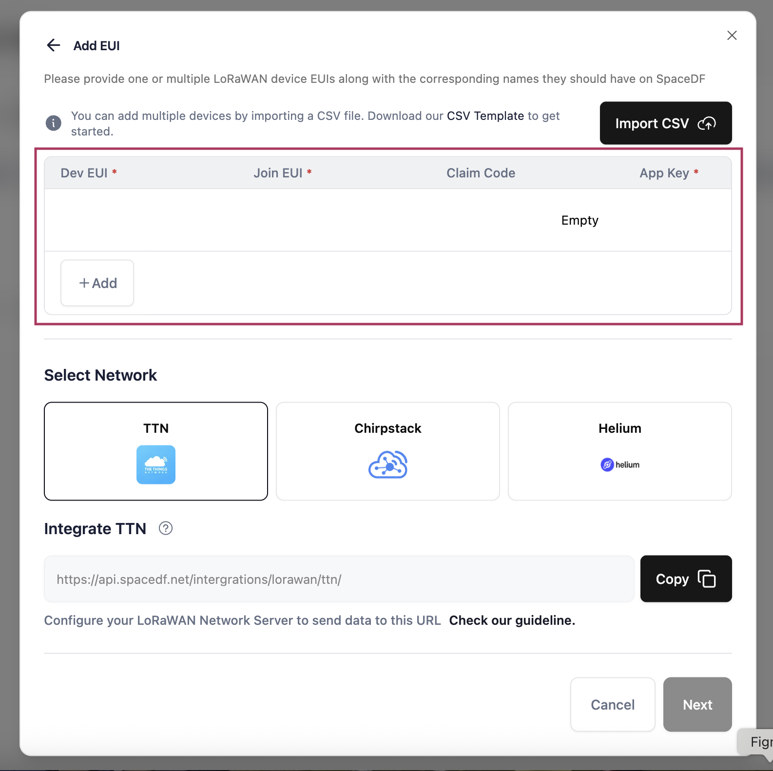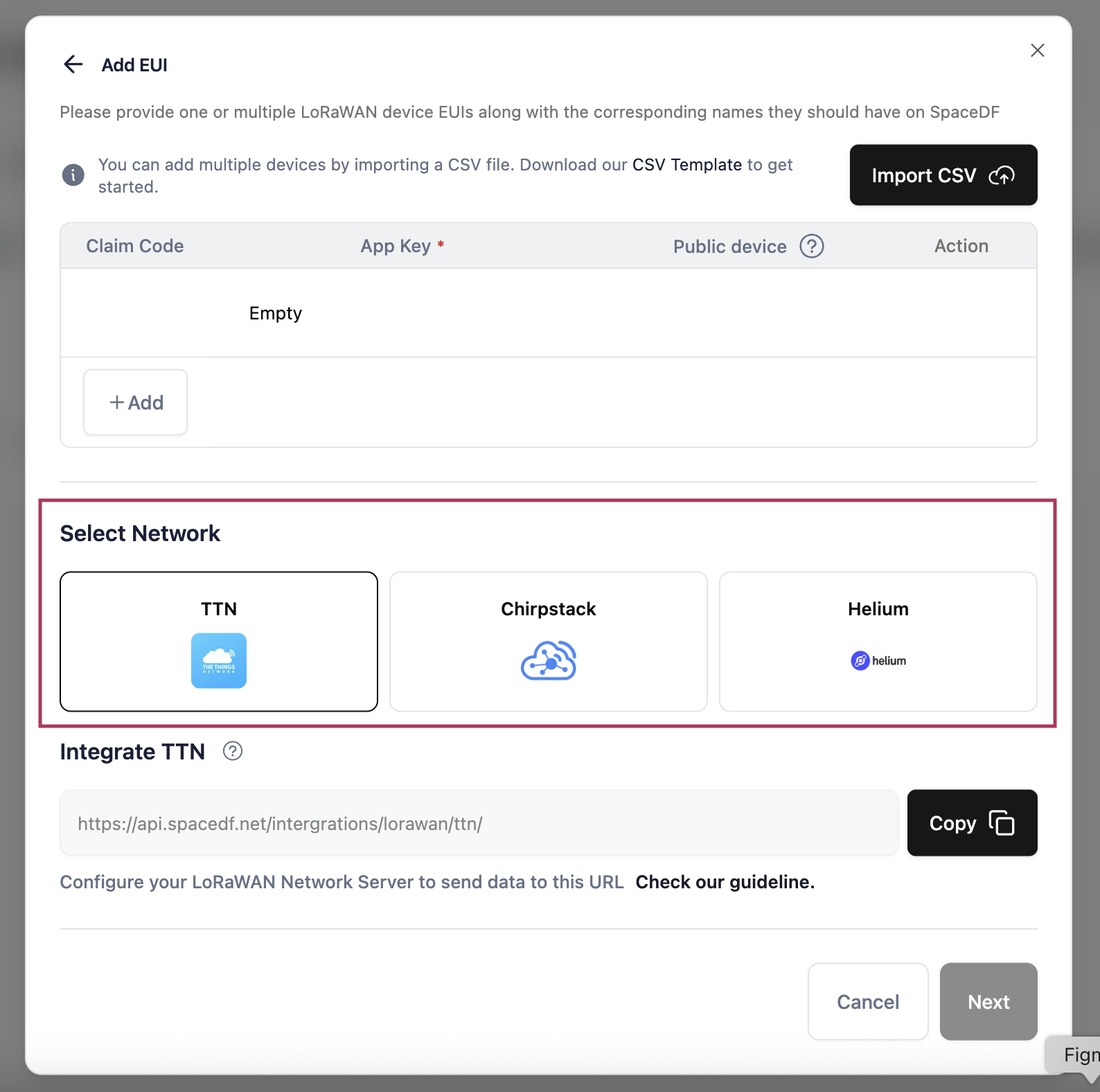 - Select Network: Choose TTN, ChirpStack, or Helium