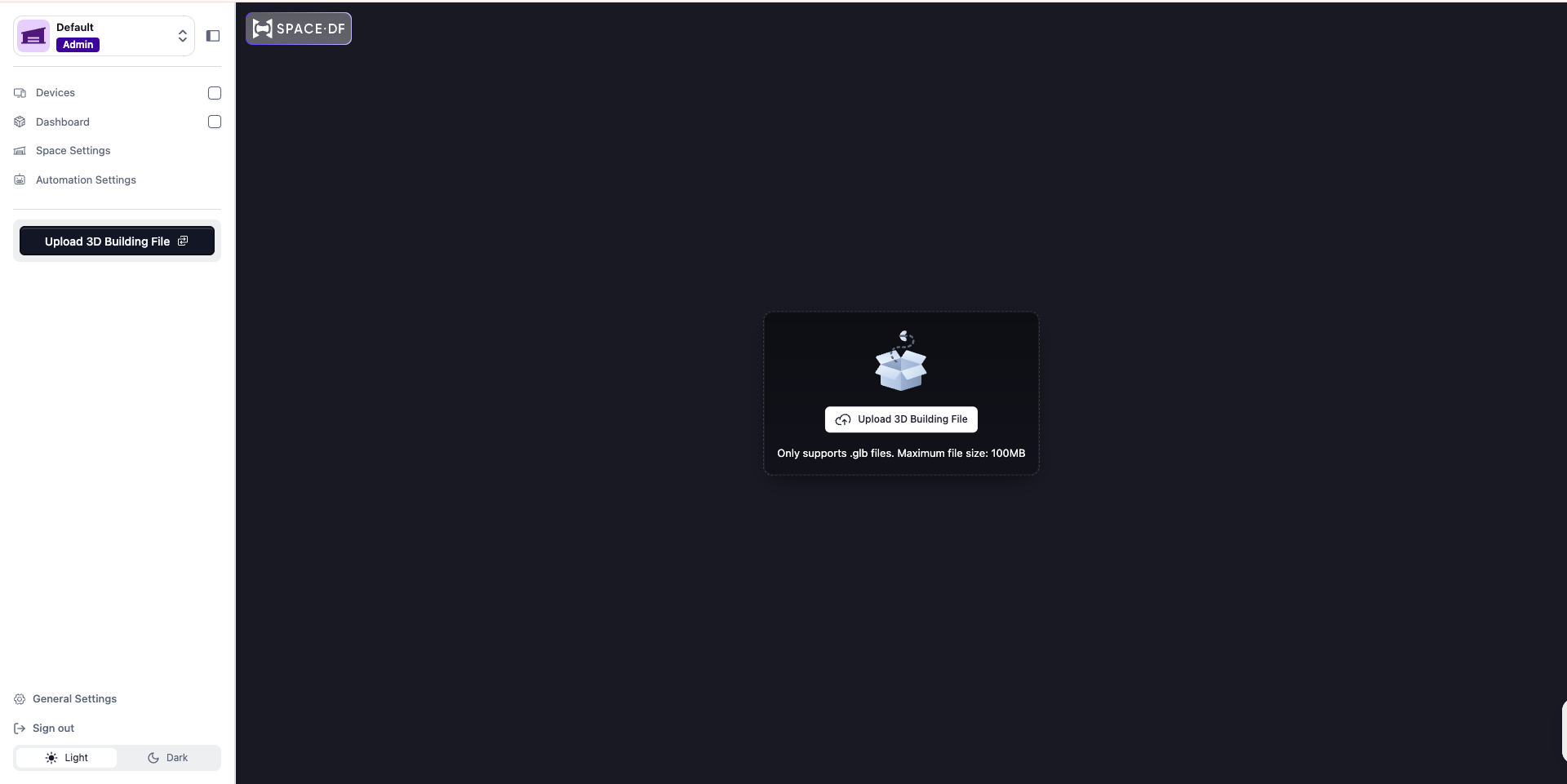 View Upload Screen: After signing in, you will see a screen asking you to upload a 3D building model to get started