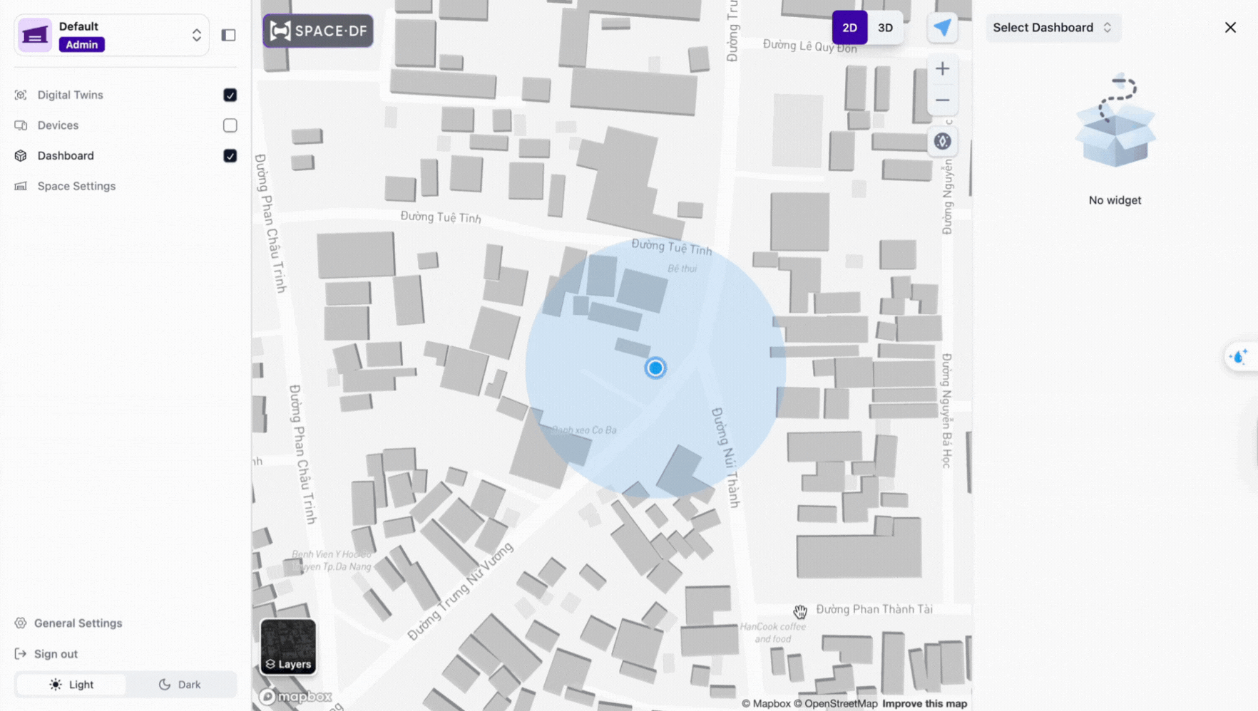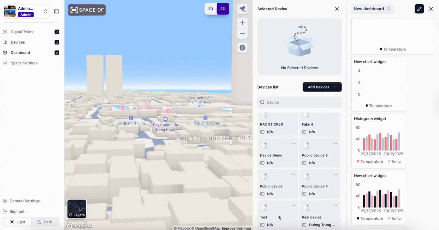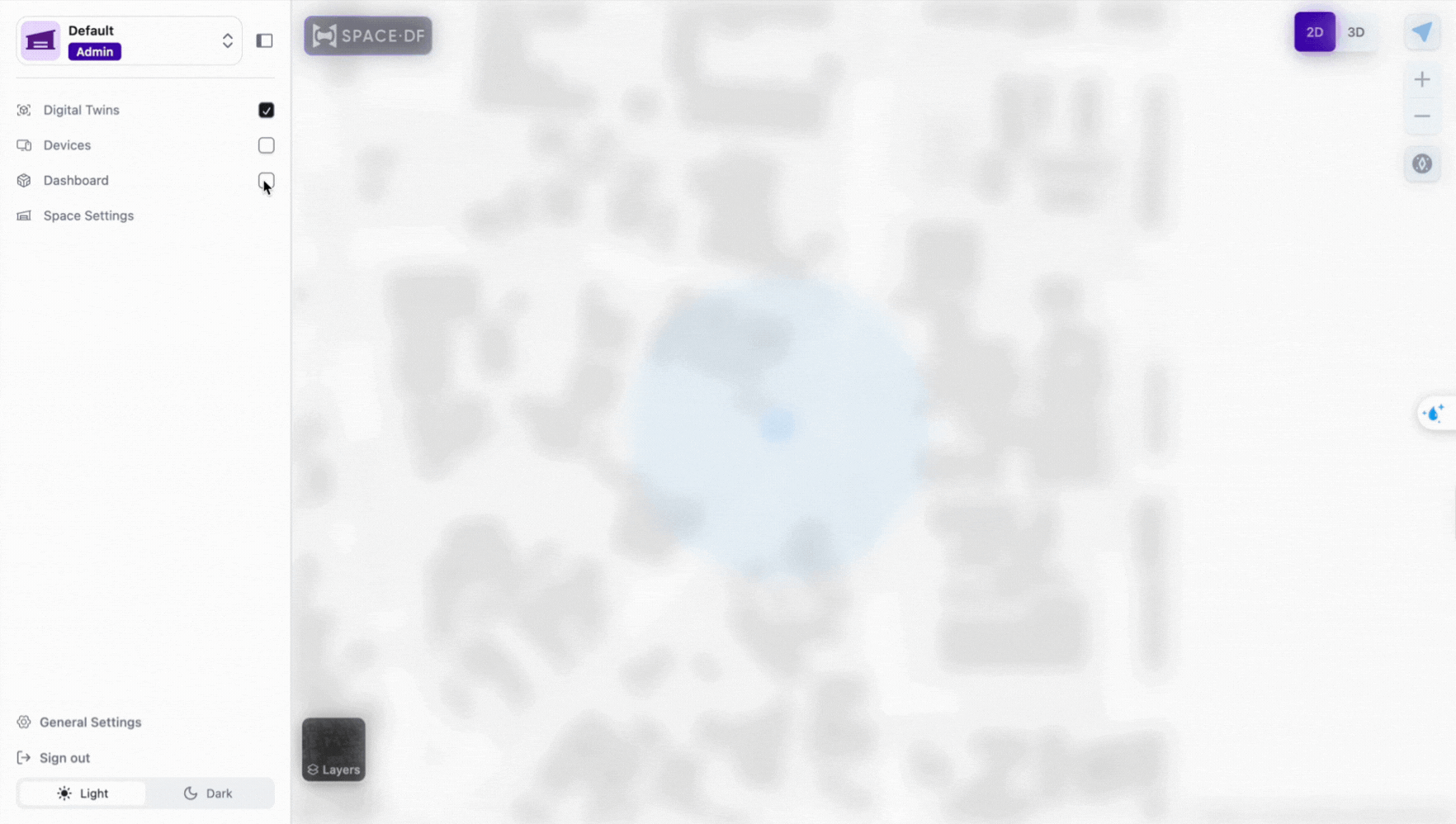 In the Space, you will see the Sidebar on the right side. This section allows you to select what to display, such as Digital Twins, Dashboard, or Devices. Tick the Dashboard to display the Dashboard section. You can easily collapse or expand the sidebar using the icon at the top.