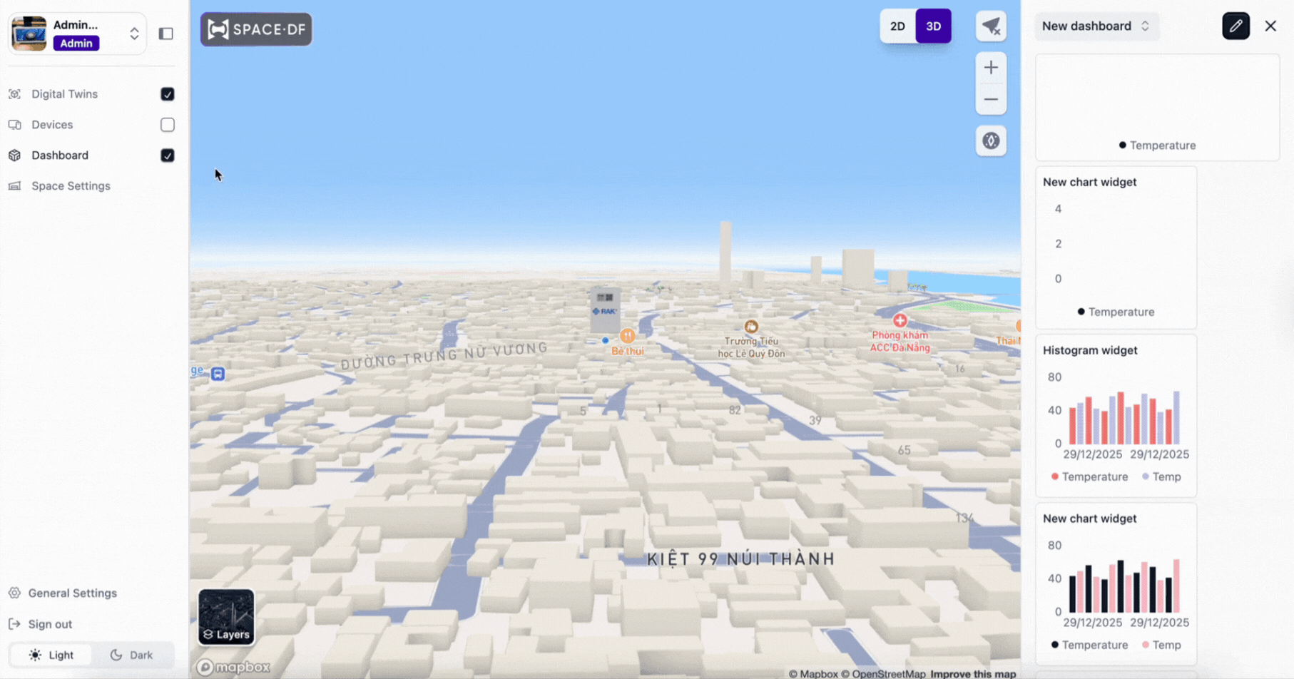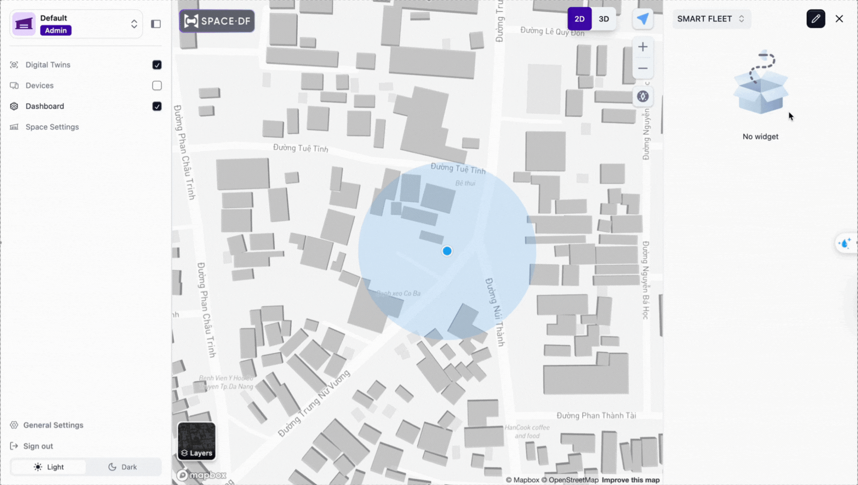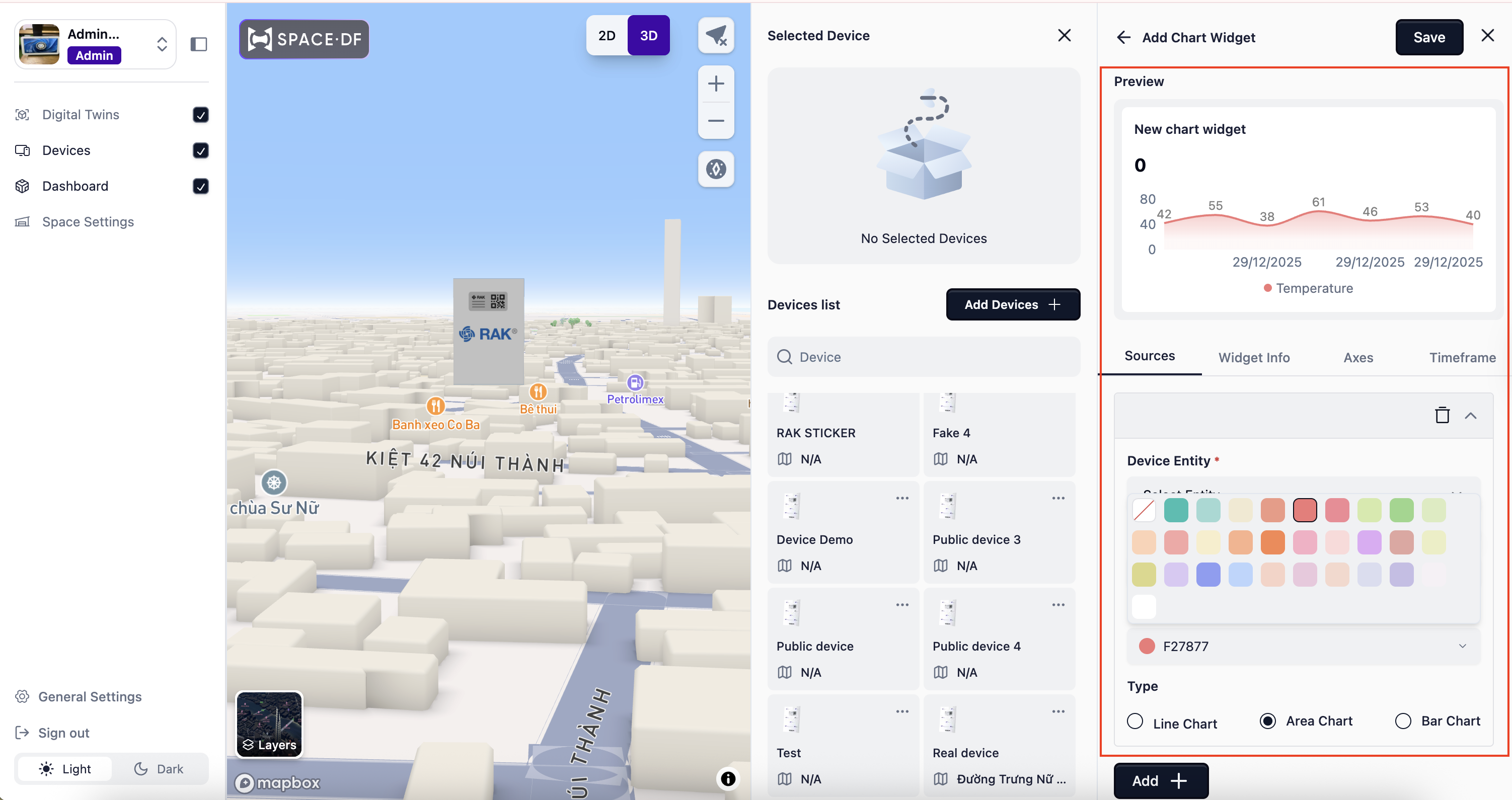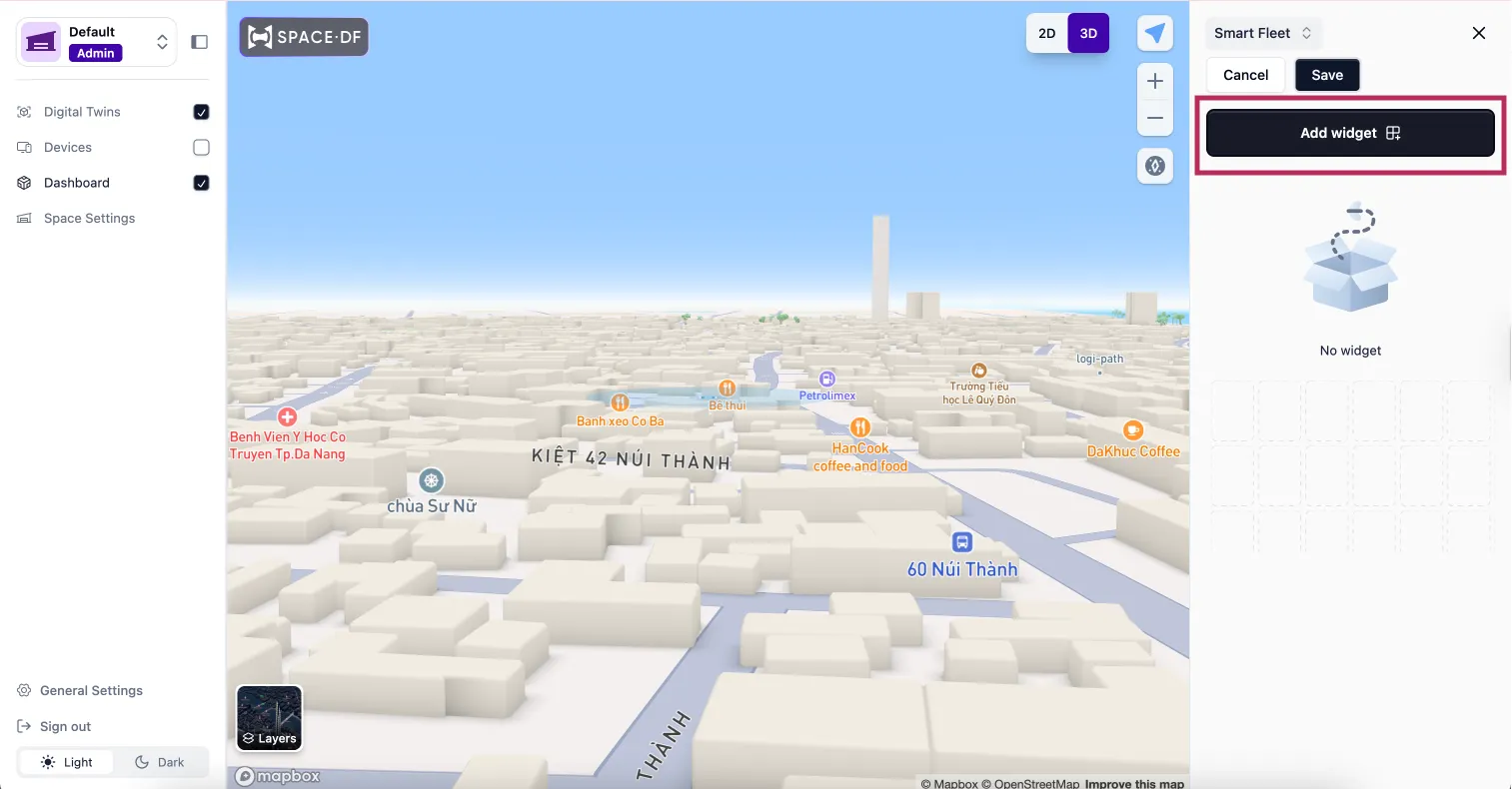 In the Space, you will see the Sidebar on the right side. This section allows you to select what to display, such as Digital Twins, Dashboard, or Devices. Tick the Dashboard to display the Dashboard section. You can easily collapse or expand the sidebar using the icon at the top.