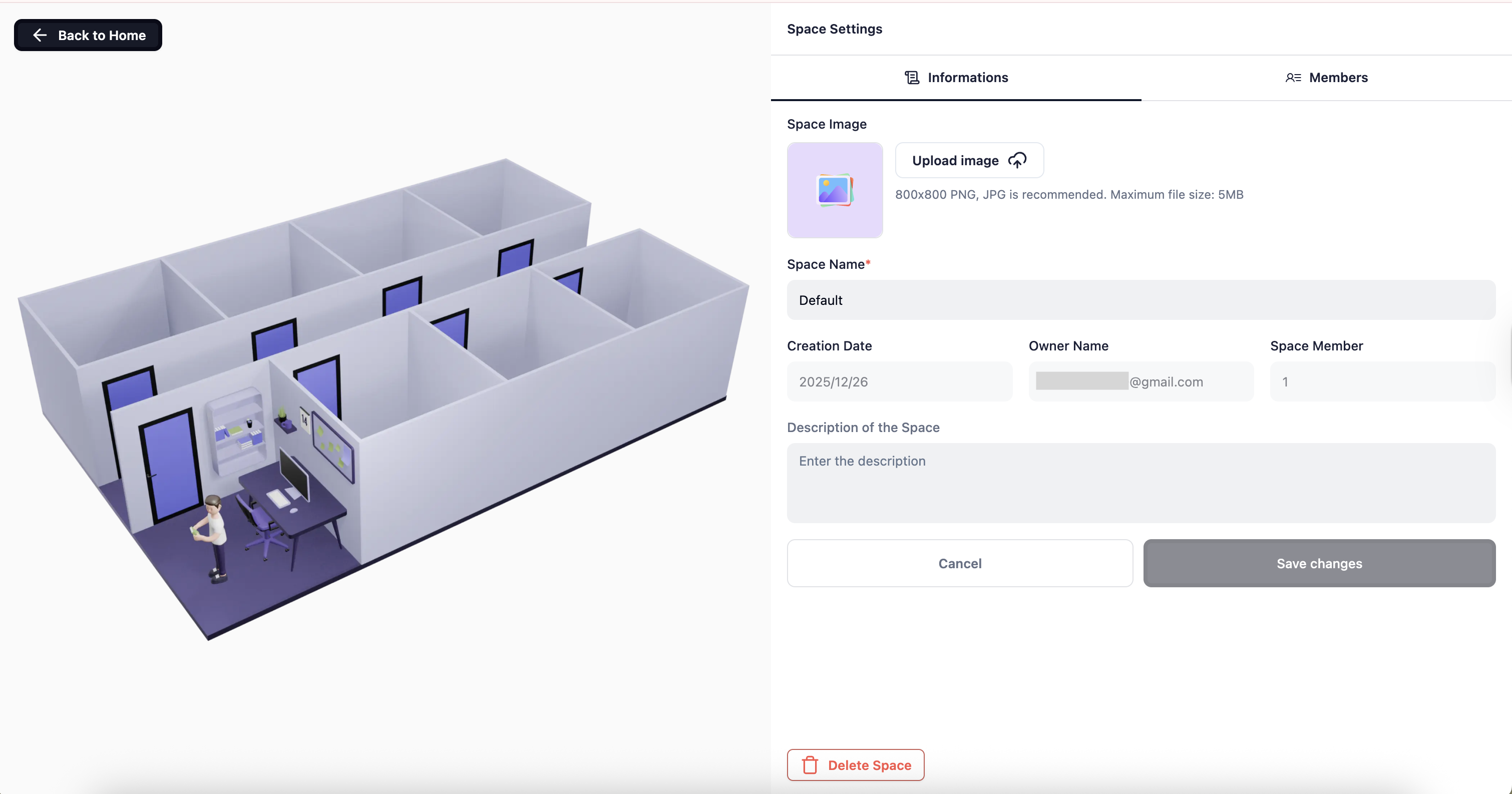 From the Sidebar, click Space Settings. In the Information tab, you can upload or change the Space image, add, update, or review details such as the Space name, description, creation date, and members.