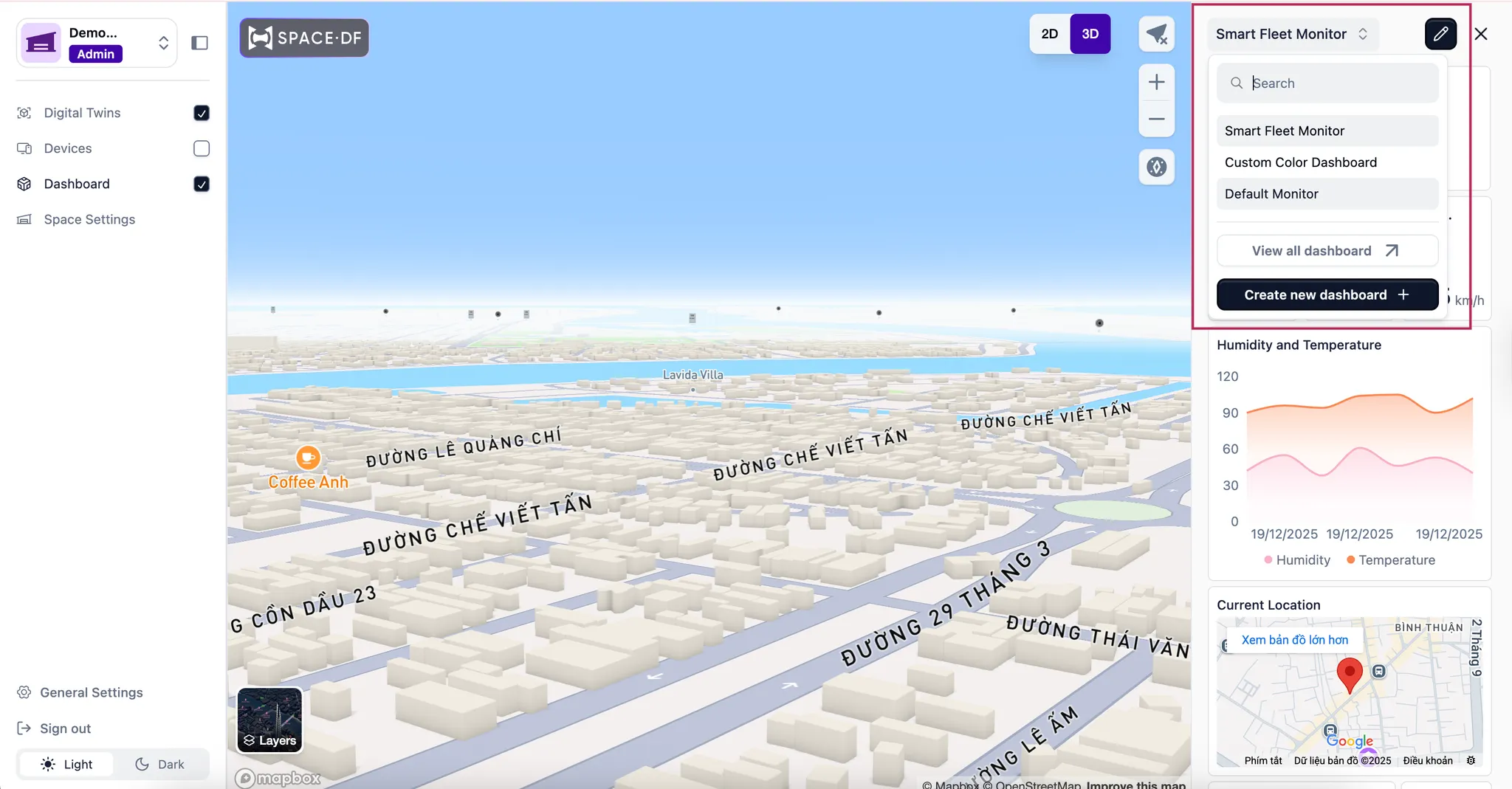 When a user switches to another Space, the Dashboard automatically updates to show data for the selected Space. This allows users to monitor different locations or projects while keeping data separate.