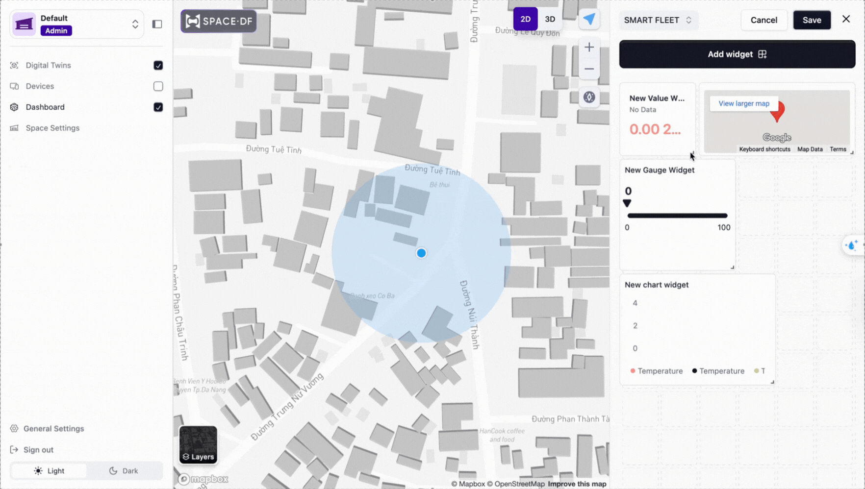 A Widget is a core building block of a Dashboard in SpaceDF. Widgets are used to present device data, system metrics, and controls in a clear, visual, and interactive way within a single Space.